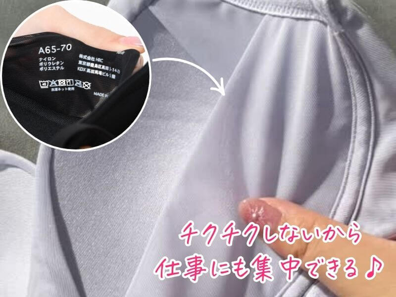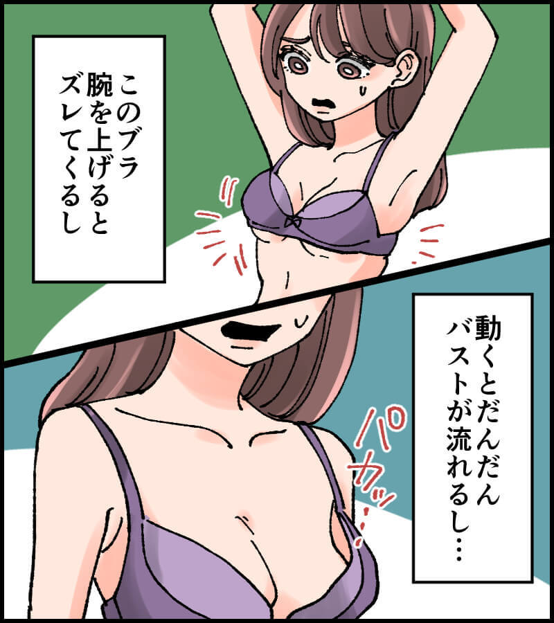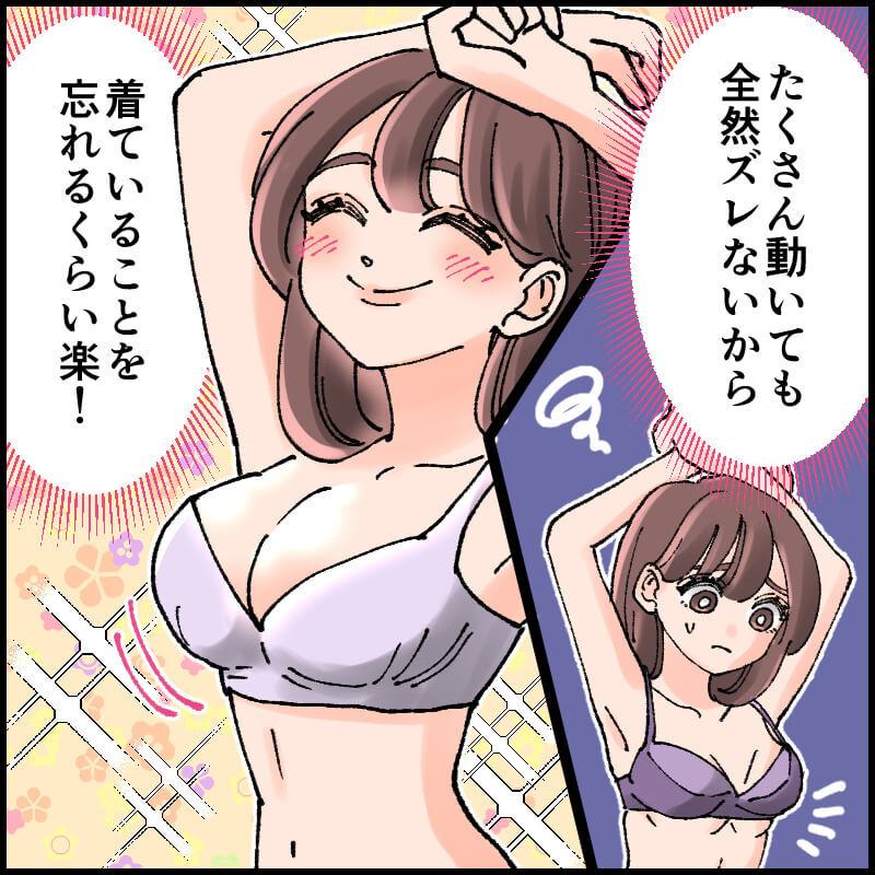 動いてもバストがこぼれずに定位置に収まって安定する感じが心地いい♪でも驚くほど着用感がなくて着けているのを忘れるほど快適です!